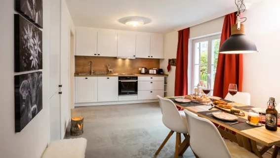 Die modernen Küchen im Landhausstil lassen keine Wünsche offen. Ausgestattet sind sie mit Spülmaschine, Induktionsfeld, Dunstabzugshaube, Backofen, Nespresso-Maschine, Filtermaschine, Wasserkocher, Toaster, Kochtöpfen, hochwertigem Porzellan, Gläsern, Besteck und noch vielem mehr. Hier macht es richtig Spaß kleine Leckereien oder auch etwas aufwendigere Gerichte vorzubereiten.
